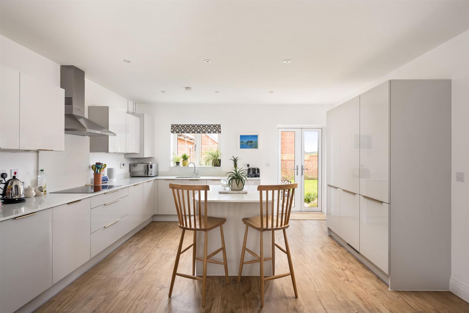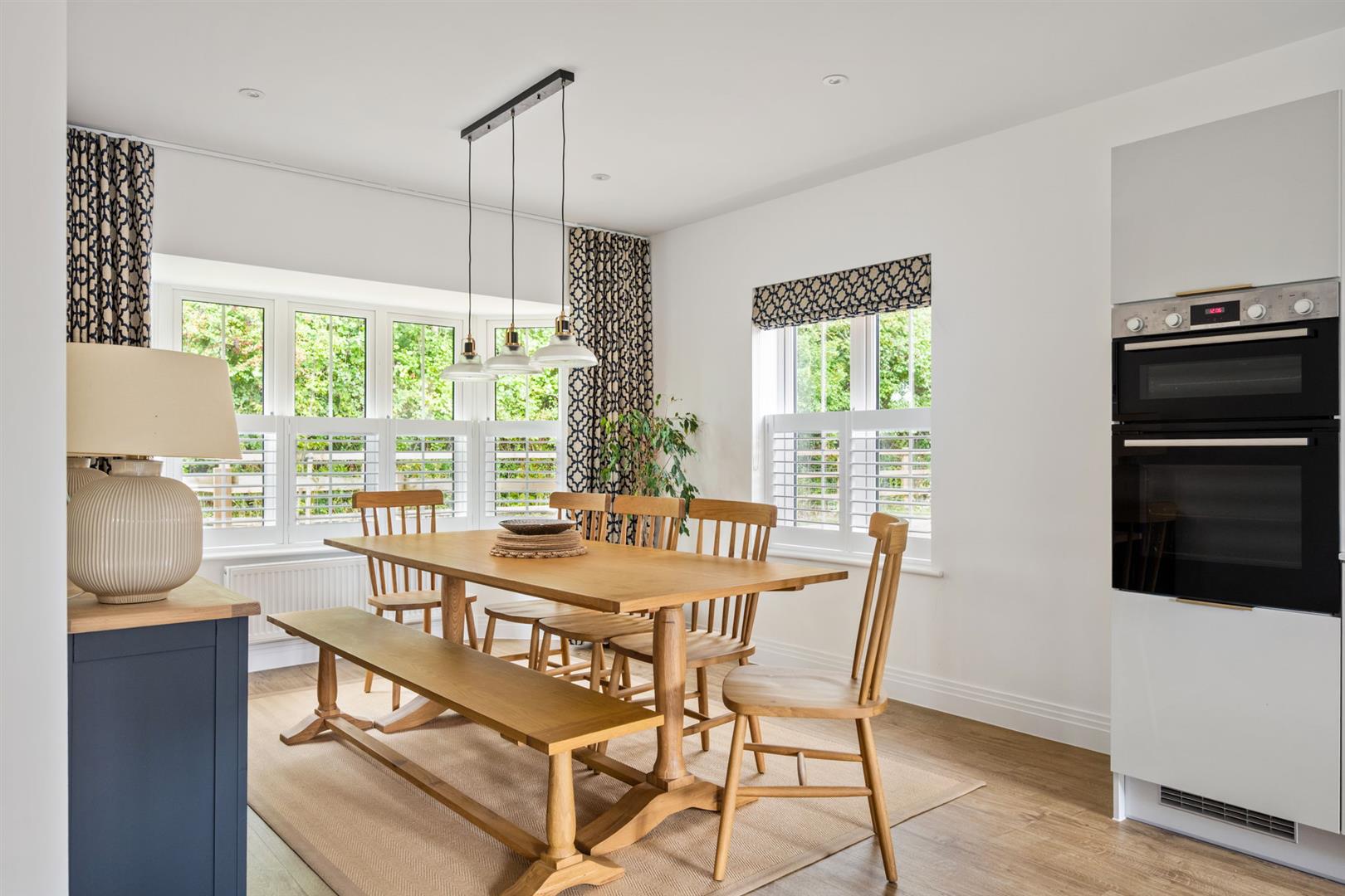 The open-plan kitchen-dining room has a bay window to front with fitted plantation shutters and blinds, and a further window to the side. The modern fitted kitchen is designed with pale grey gloss cupboards, and quartz composite worktop and splash-back, with a stainless steel 1 1/2 bowl sink inset. Integrated appliances include an induction hob with stainless steel extractor hood over, a dual oven, a fridge freezer, a dishwasher, and gas boiler. French doors lead out to the garden. The island features a quartz composite top with a breakfast bar and storage under. The dining area has space for an 8-10 seater rectangular table, with attractive lighting above.