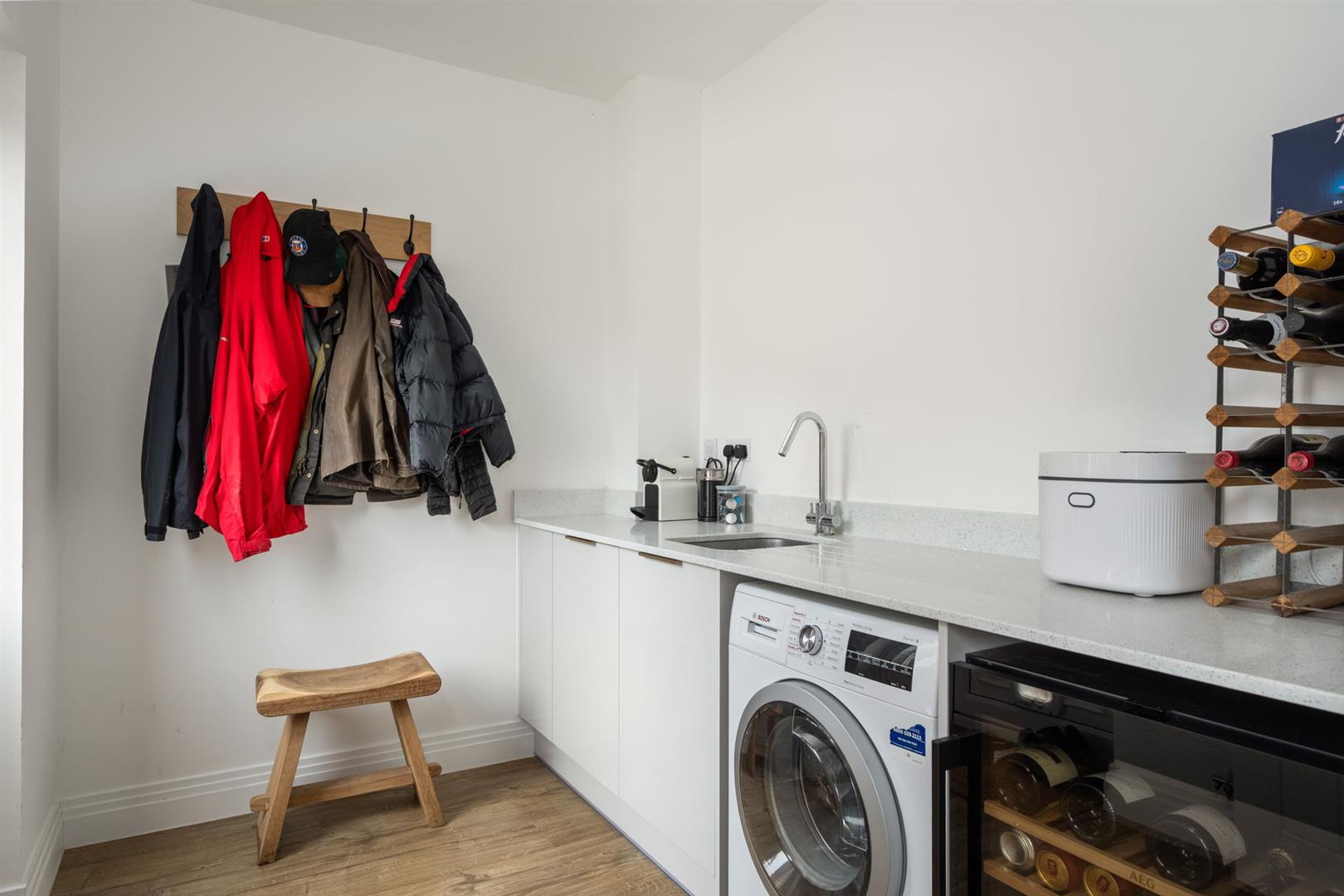 The utility room has space for a washing machine and tumble dryer. Fitted cupboards and a quartz composite worktop with a stainless steel sink inset. A part-glazed UPVC door leads out to the patio and garden.