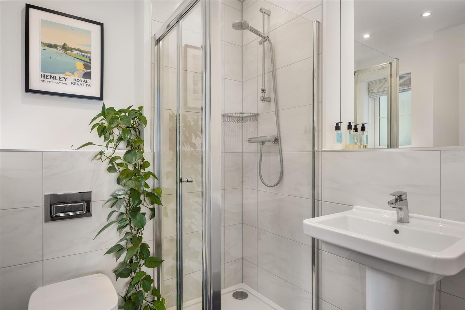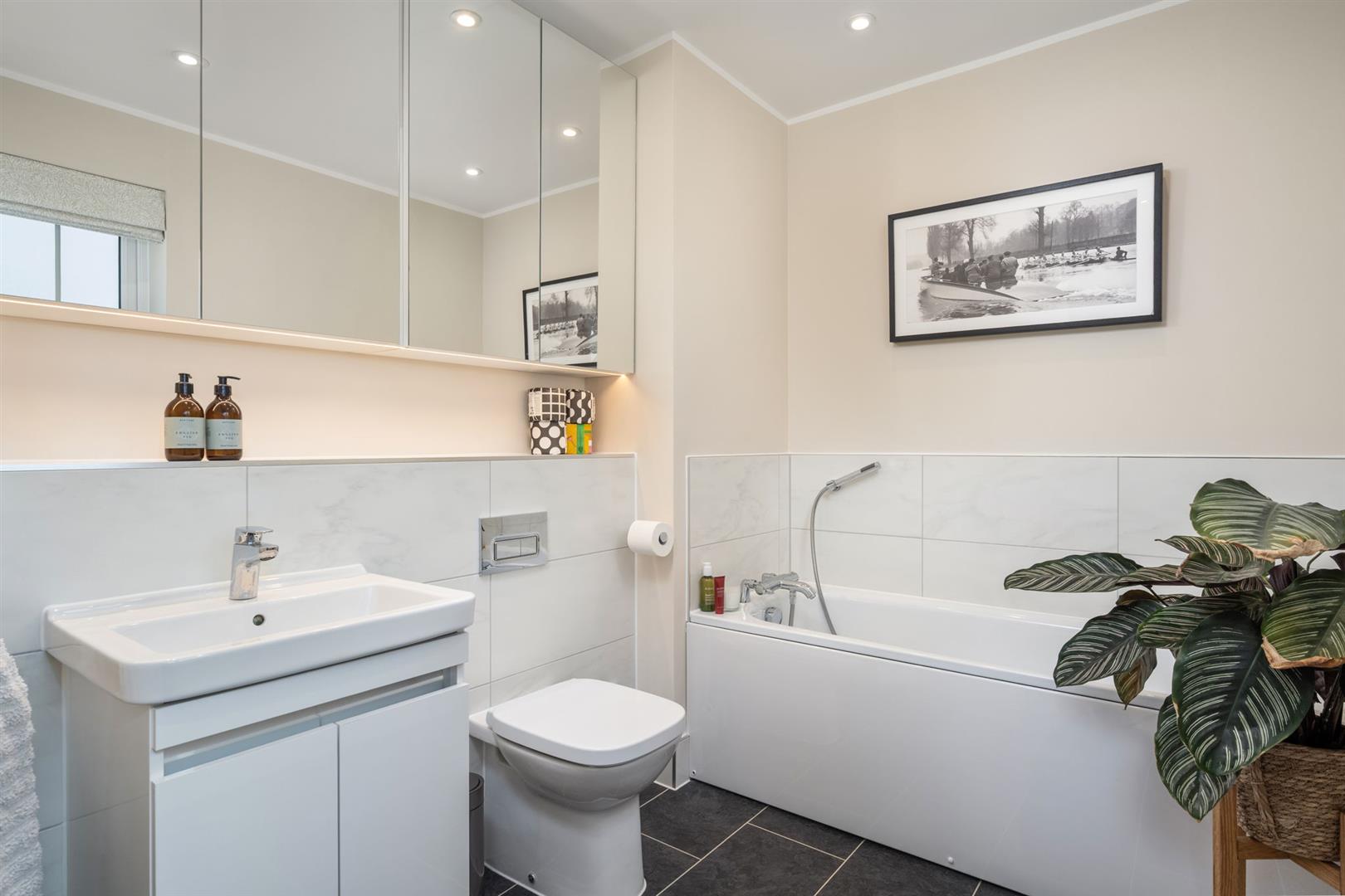 The family bathroom has a window to the front, a heated towel rail, a broad wall mirror over the bath, which has a shower attachment; a wash hand basin sits in a useful storage cabinet, with a w.c., and a tiled walk-in shower.
