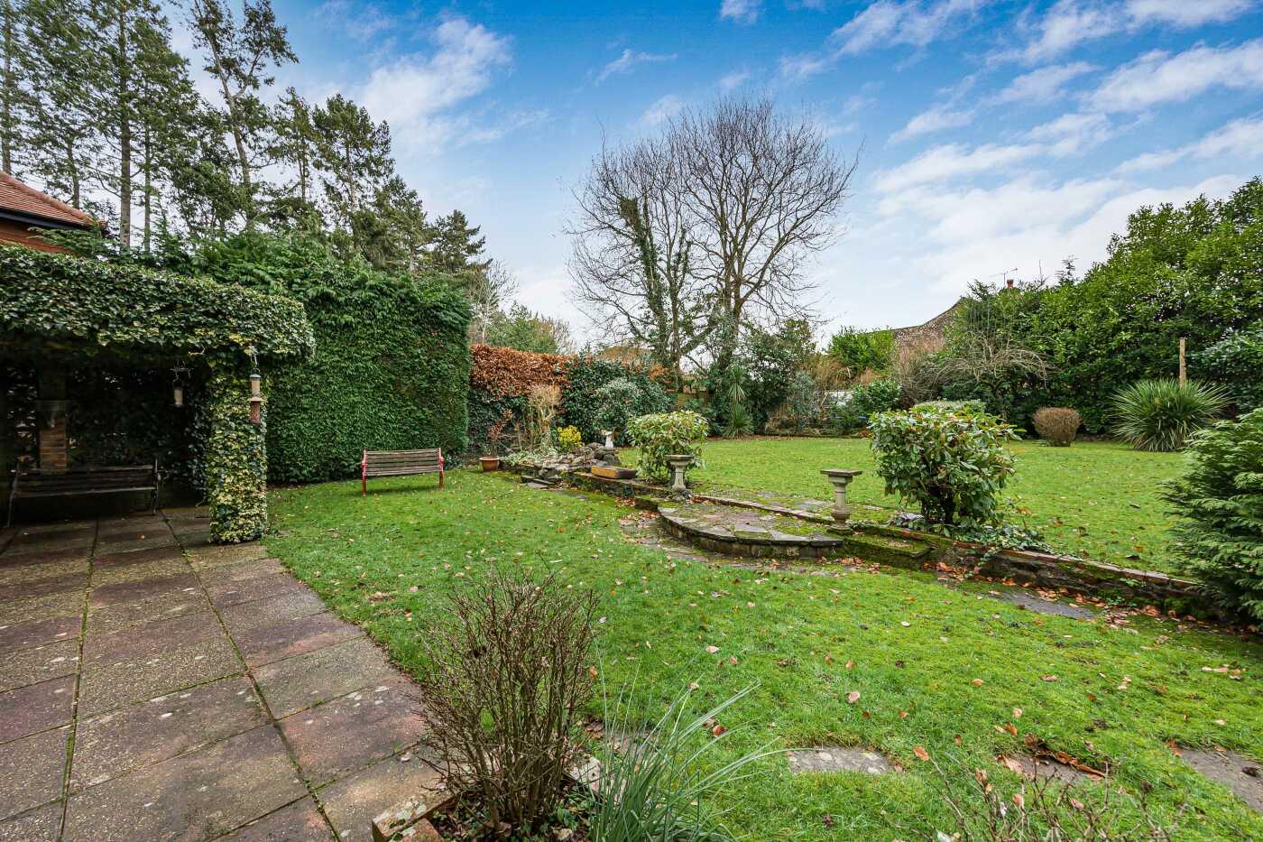 - South-facing garden with mature trees and shrubs