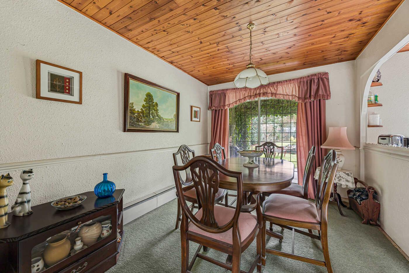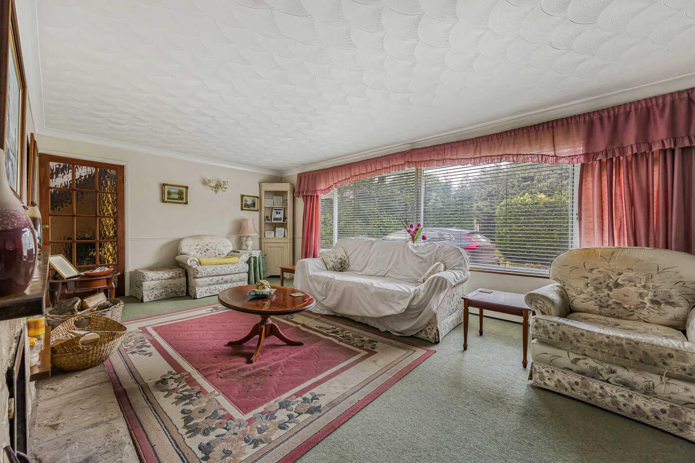 The living room has a front aspect with a large picture window and an open fireplace. Doors open into the dining room with sliding doors opening to the rear garden.