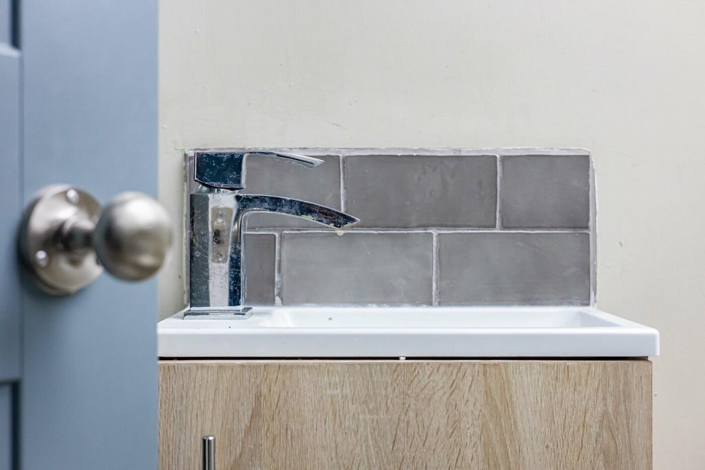 The kitchen has modern white wall and base units, with wood-effect worktops over with white ‘metro’ style wall tiling and a stainless steel sink which sits beneath a window. Appliances include an electric 4-ring induction hob with electric oven under and extractor hood over. There is space for a washer/dryer under the work top and space for a free-standing fridge/freezer.