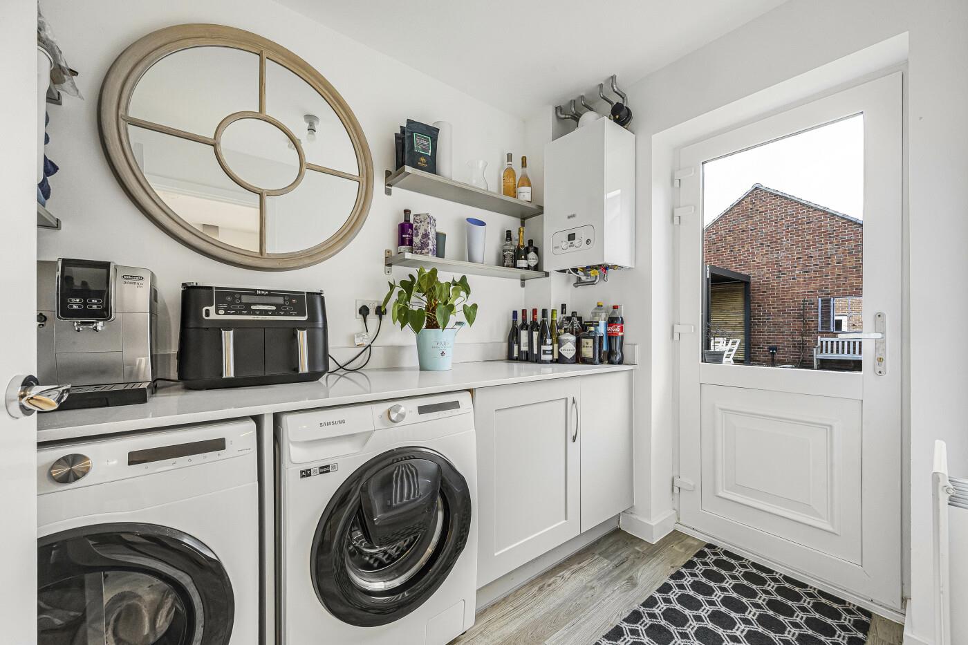 The heart of the home is the impressive open-plan kitchen and dining room, perfect for both everyday living and entertaining. There is an extensive range of 'Shaker' style wall and base units with quartz work-surfaces over and an inset 1 1/2 bowl stainless steel sink unit, a built-in electric oven with induction hob and extractor fan over. Integrated appliances include and larder style fridge freezer and a dishwasher. Windows have both front and rear aspects. A door opens to the utility room.
