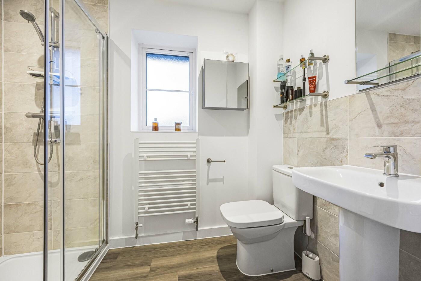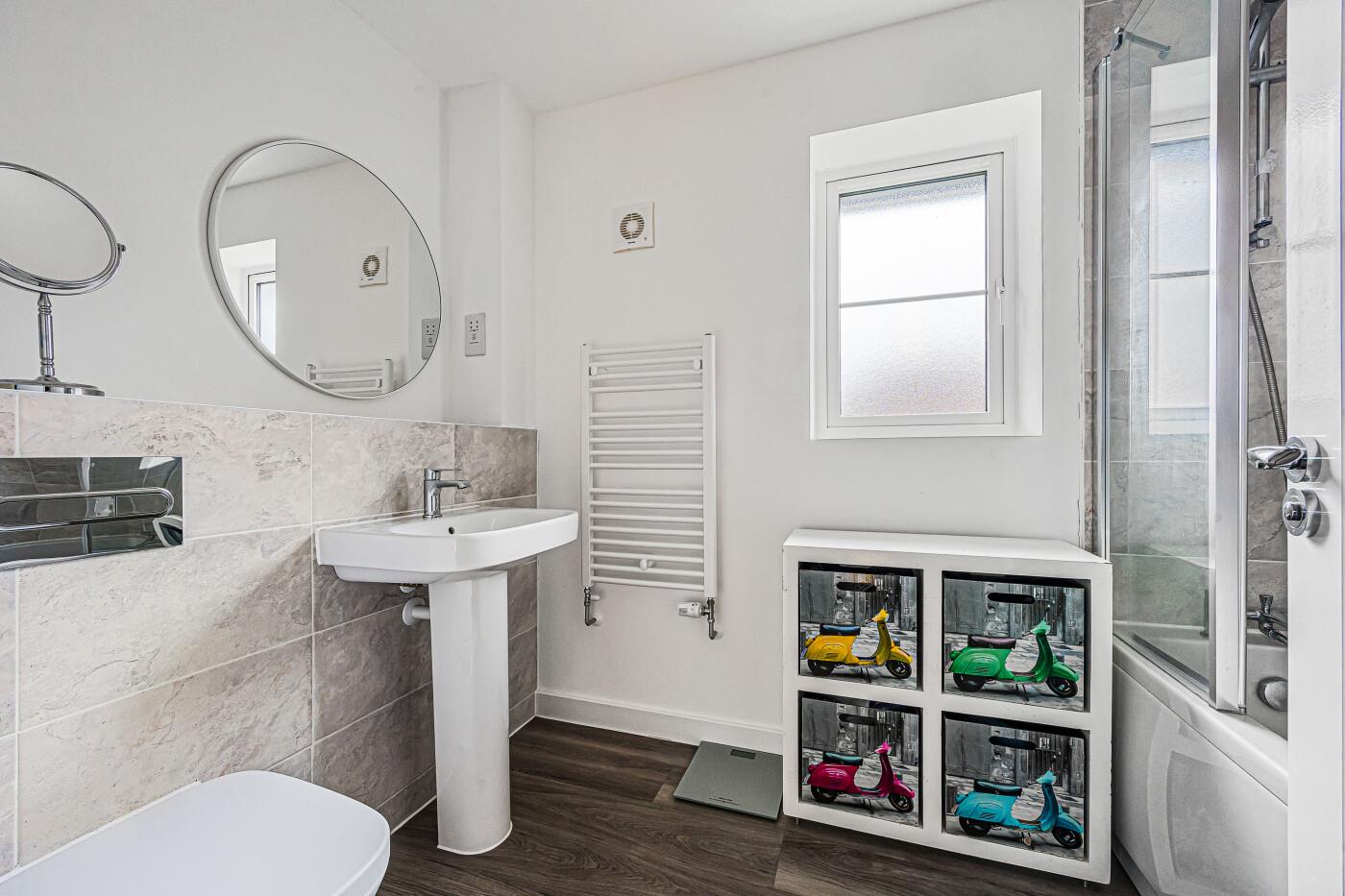 The principal bedroom has a front aspect and benefits from fitted wardrobes. The en-suite shower room has a white suite comprising a shower cubicle, a low-level w.c and a wash-hand basin, part-tiled walls and a heated towel rail.