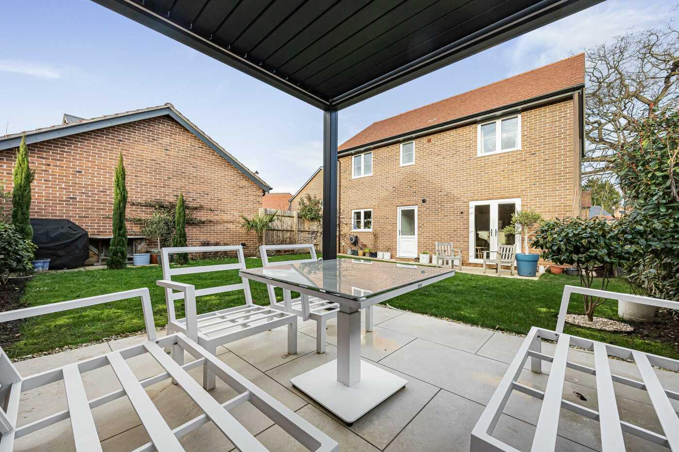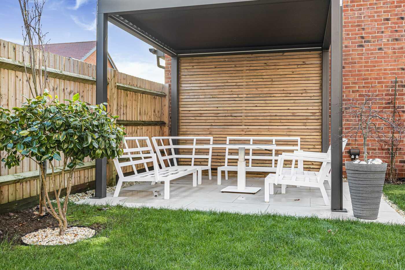 - Patio with pergola, lawn and established planting