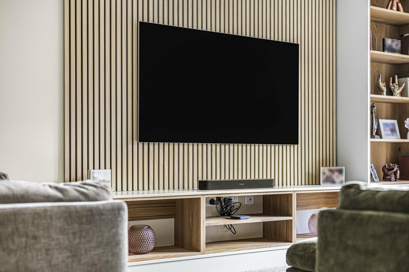 The generous sitting room has a rear aspect with glazed French doors opening to the rear garden. There are fitted shelves with a slatted wood panel with central TV mount.