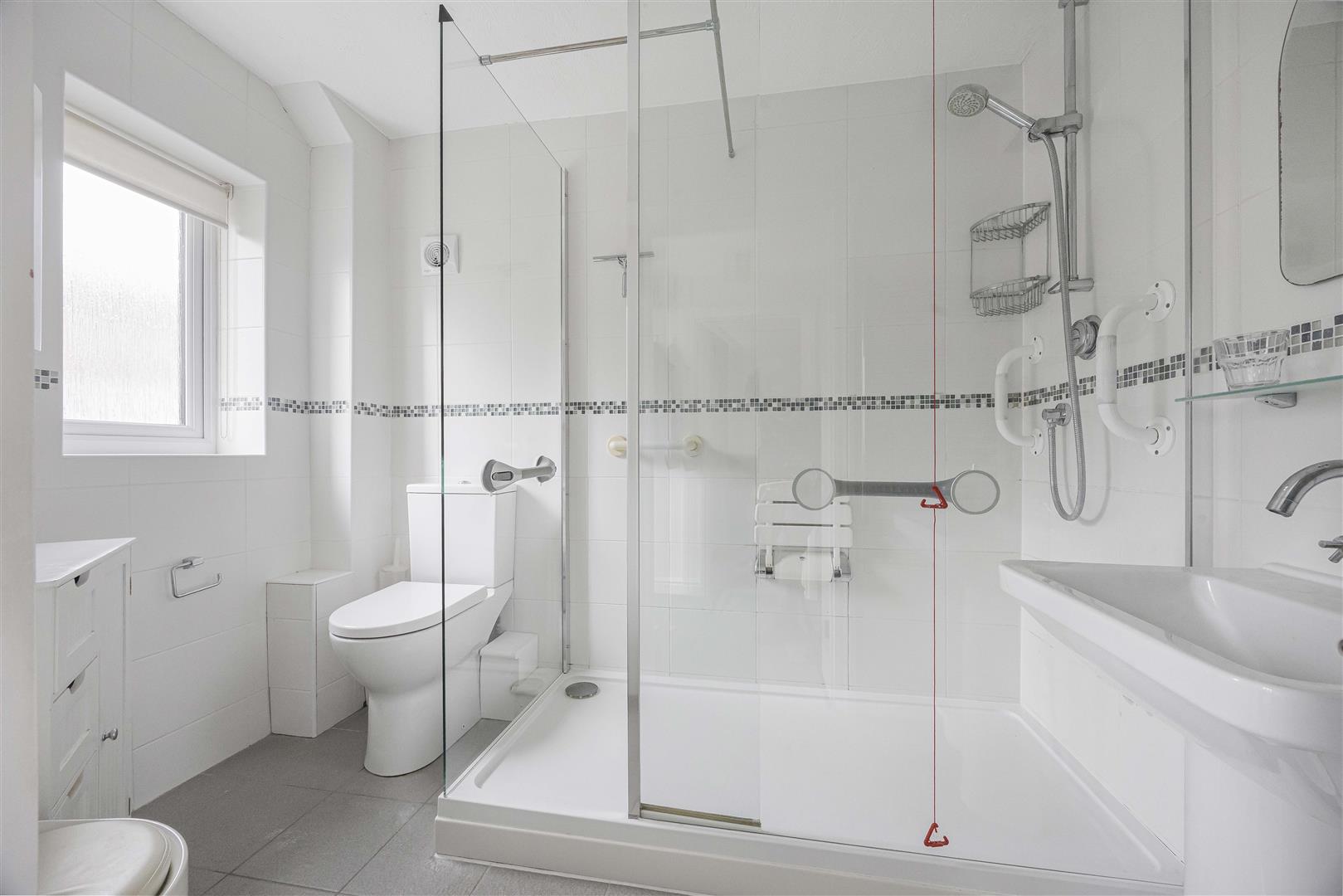 The shower room has a walk-in extra large shower cubicle, a w.c. and a wash-hand basin. The walls are predominantly tiled.