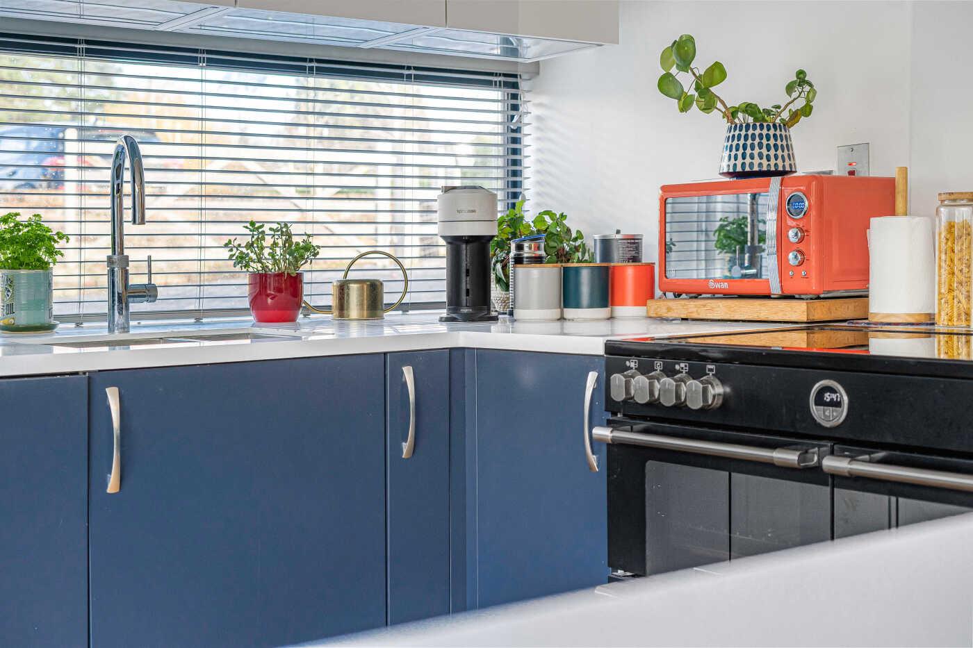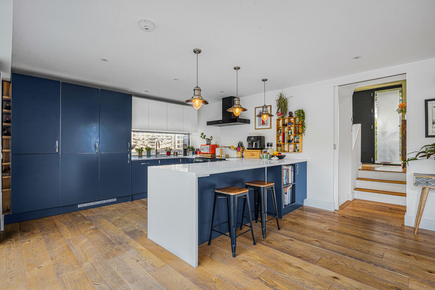 A particular feature of this property is the impressive open-plan kitchen and dining room with floor to ceiling sliding doors across spanning the full width of the space, opening to the rear garden. The kitchen has an extensive range of blue and white fitted wall and base units with Corian work surfaces over and an inset sink unit with a mixer tap. There is an electric stove oven with an induction hob and extractor hood over, an integrated fridge and freezer and a dishwasher. The peninsular and breakfast bar also provides additional storage.
