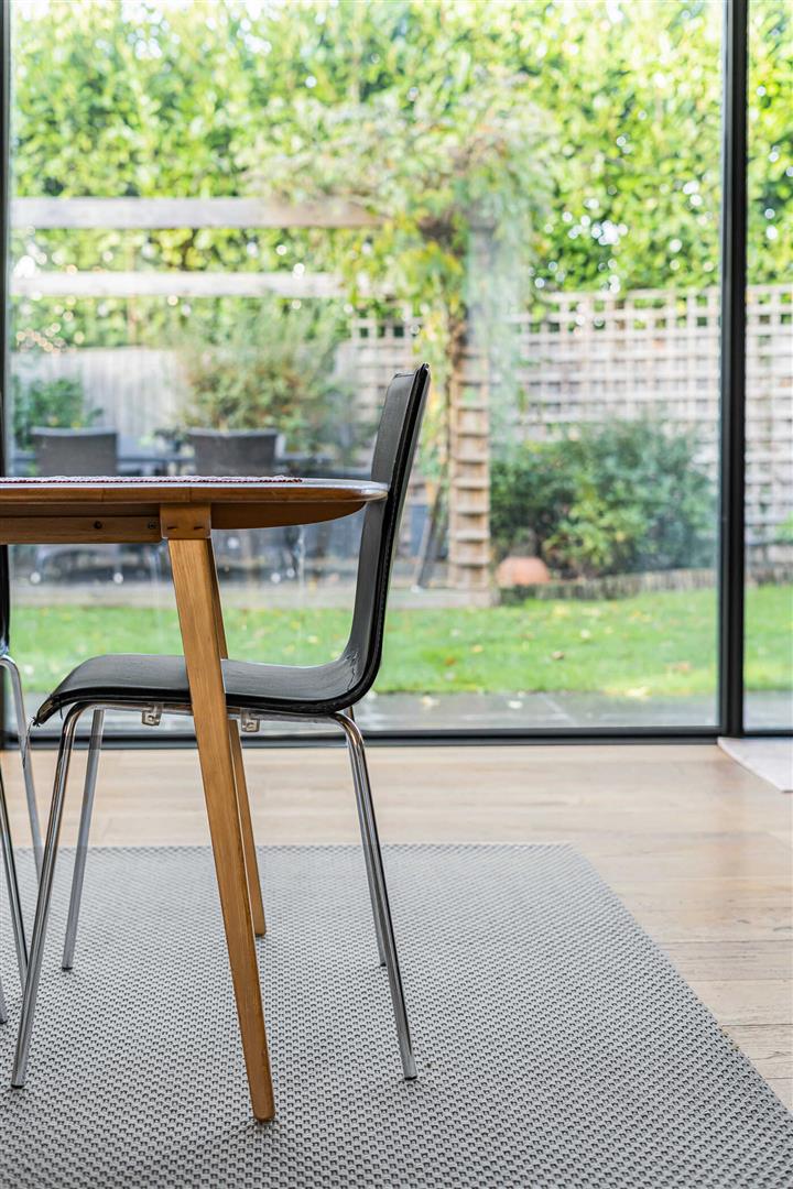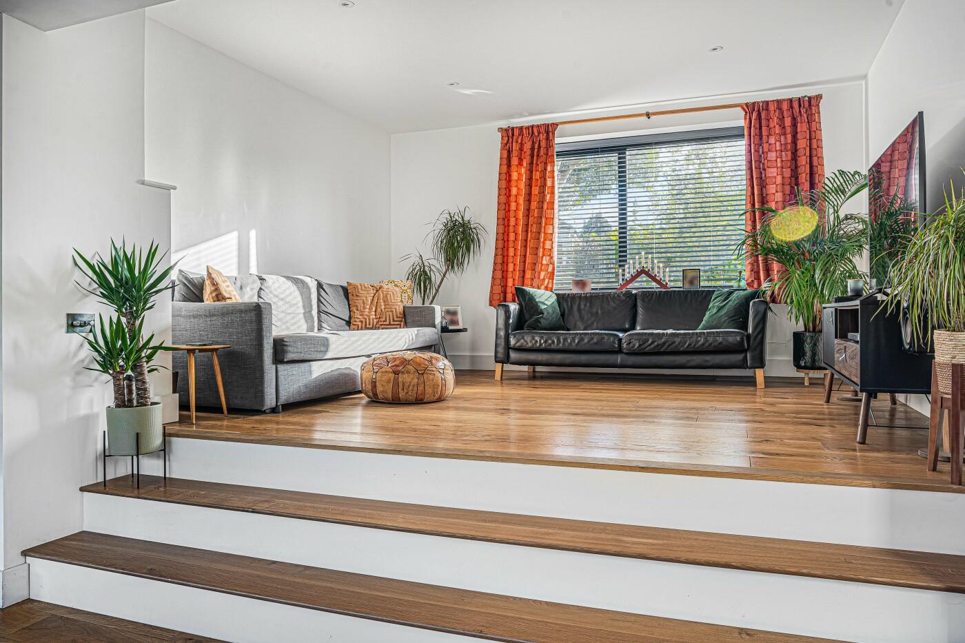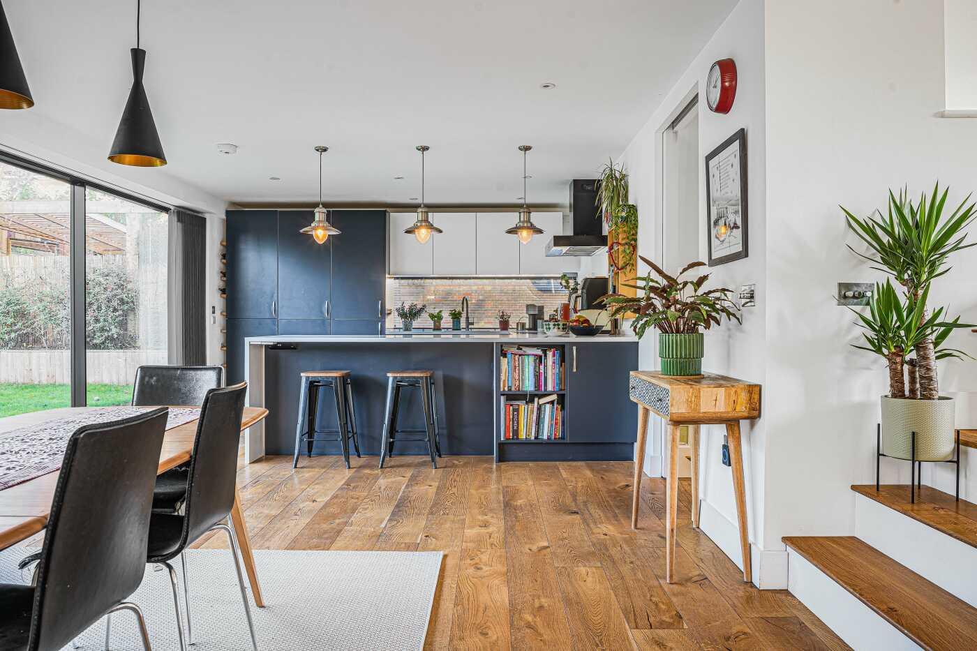 The dining room rear aspect overlooking over the rear garden and a window to the side allowing more natural light. Steps lead up to the sitting room which has a front aspect with a south-facing picture window, polished timber flooring and recessed spotlights.