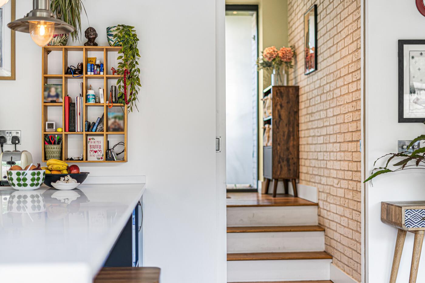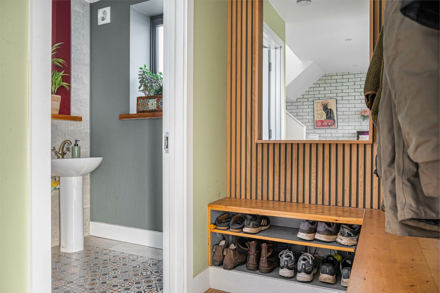 The entrance hall has a polished timber floor, fitted timber shoe storage and bench with some timber panelling, an exposed brick wall and a stairwell to the first floor and lower ground floor.