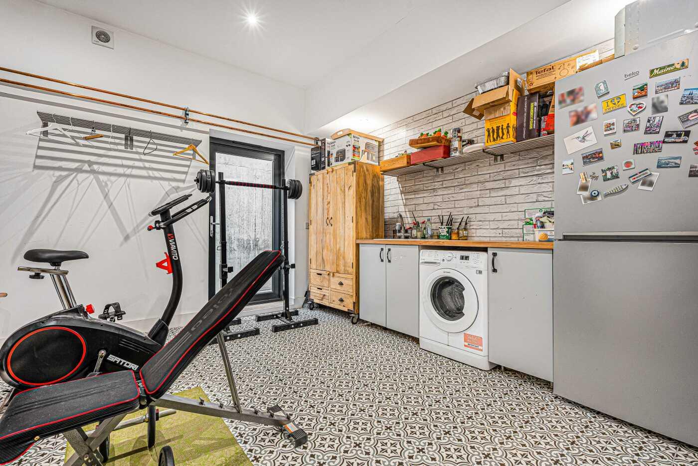 A door opens to the gym/utility room, which has further base level units with work surface and an inset sink, plumbing for the washing machine and the heat exchange unit or the central heating, a glazed door to outside and tall wooden unit and fitted cabinets are included.