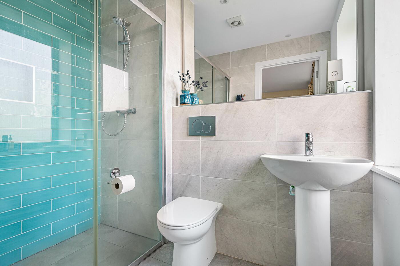 The fully tiled en suite shower room has a white suite comprising a wash hand basin, a w.c. with a concealed cistern and a double shower with a sliding glass door and a heated towel rail.