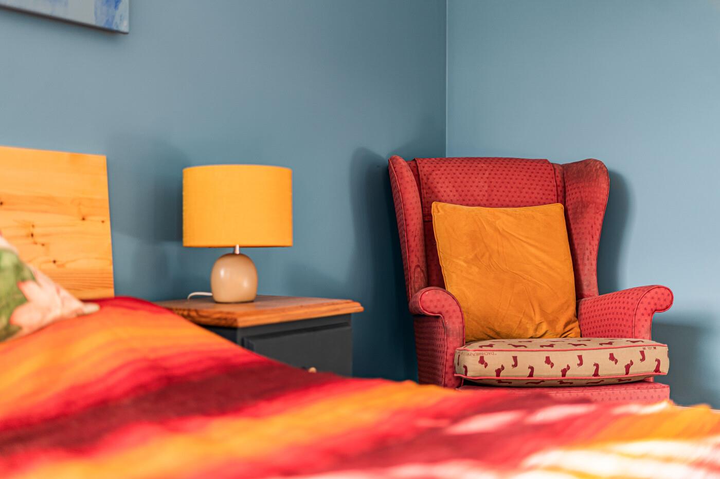 The family room/bedroom 5 is currently being used as an artists studio with a floor to ceiling window and a glazed door allowing plenty of natural light into the space. There is some decorative wooden cladding to one of the walls and the sofa and TV unit are included.