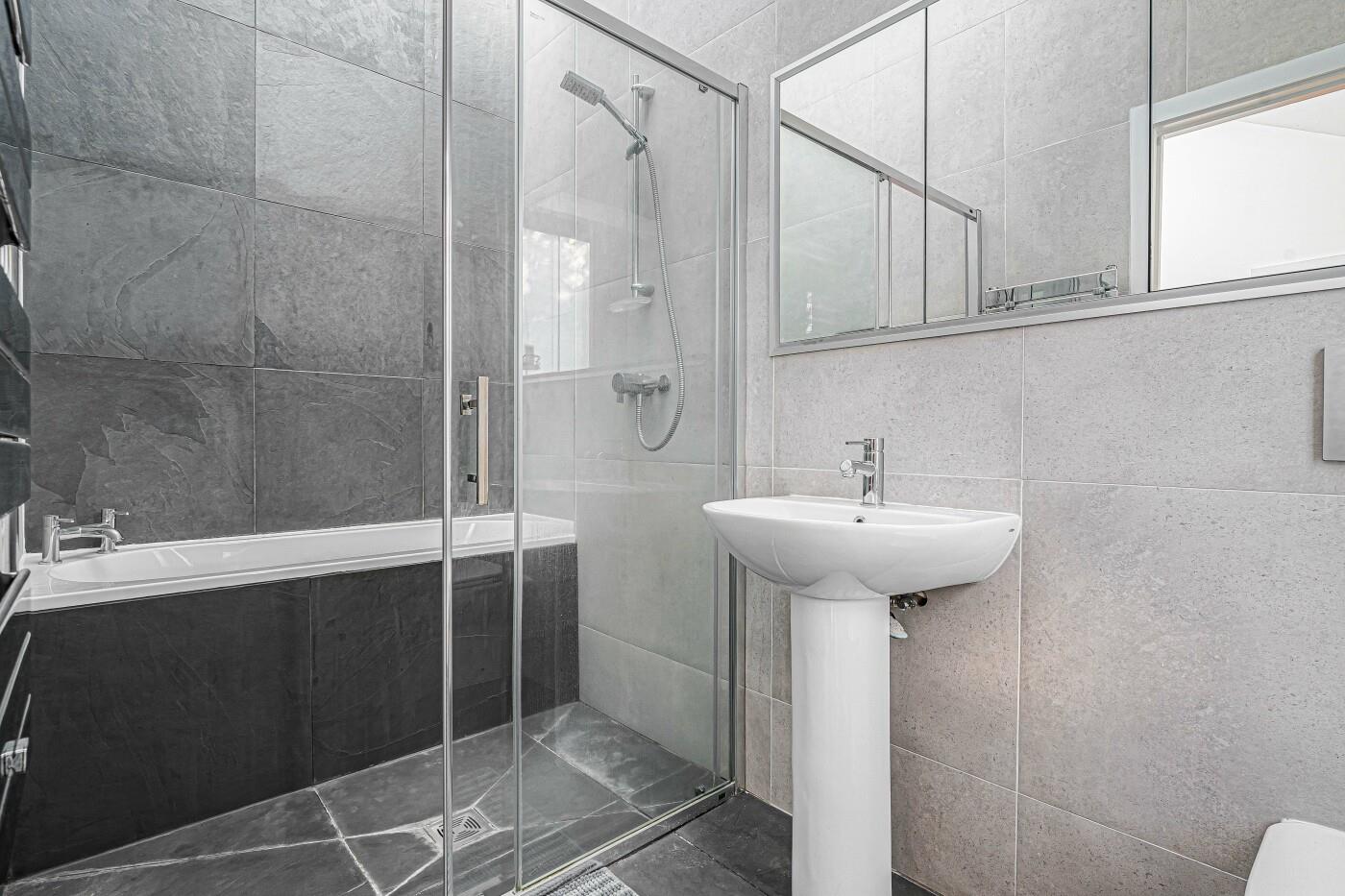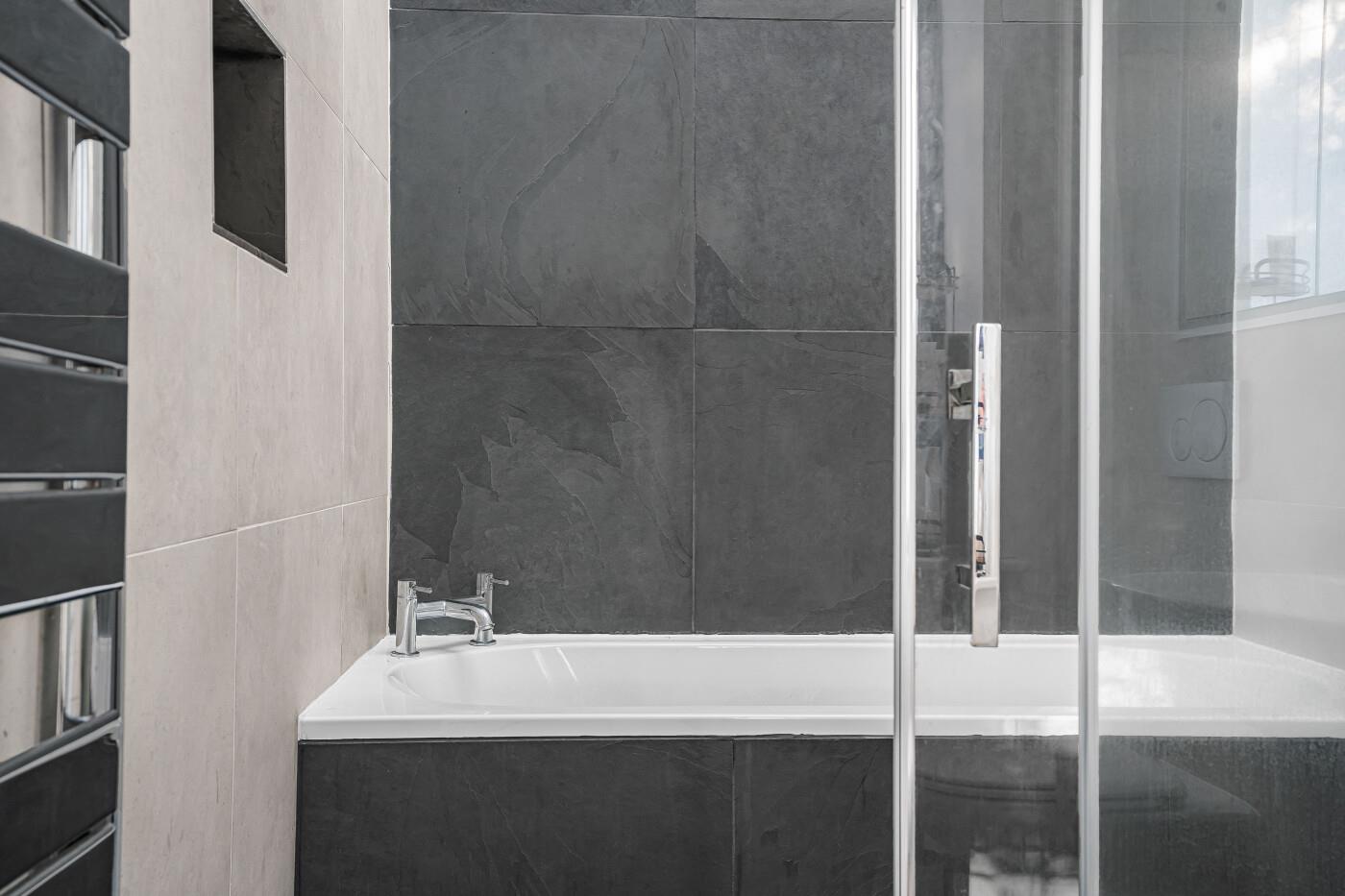 The family bathroom has fully tiled walls and a white suite comprising a combined double width shower cubicle with a glass screen and a panelled bath with mixer tap, a wash hand basin, a w.c. and a heated towel rail.