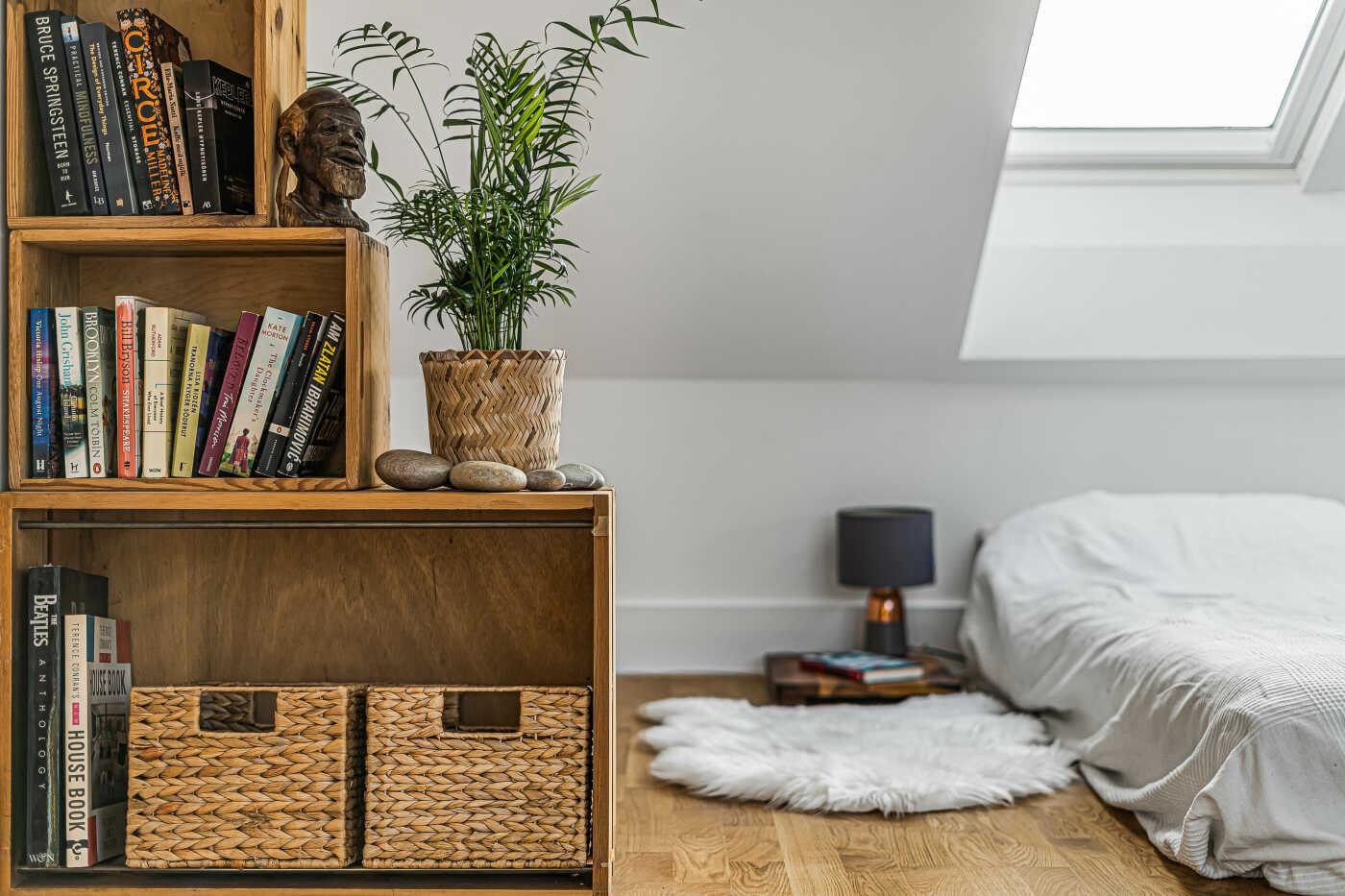 The guest bedroom suite has a bedroom with a raised sleeping platform, natural wood flooring, skylight windows and doors opening to a walk-in wardrobe.