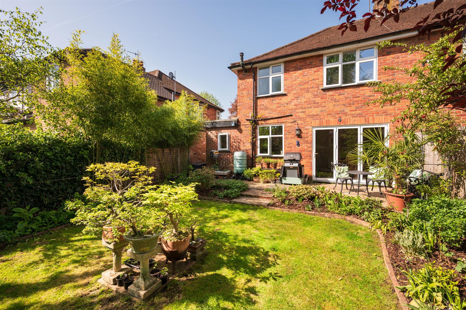 Bifold doors open from the dining area to the private landscaped rear garden. A patio terrace provides space for outdoor seating/dining, which leads to the lawn leading to mature shrub beds and trees providing a degree of privacy. Enclosed by panel fencing.