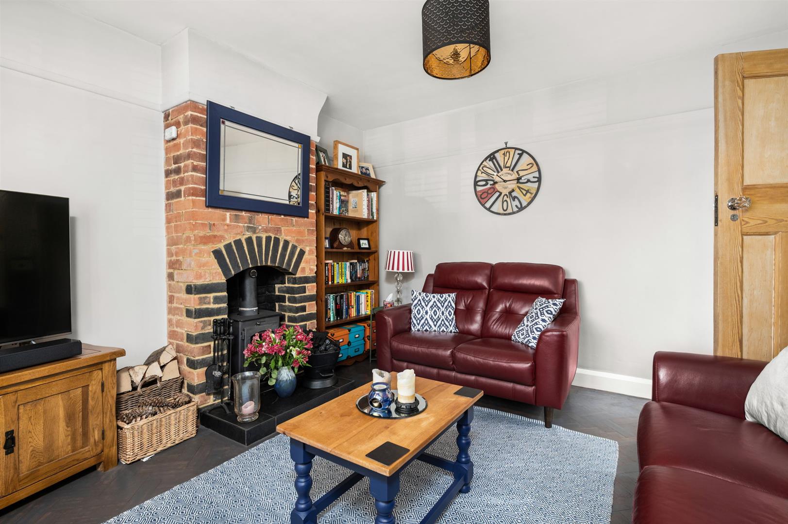 The sitting room also features parquet flooring, a double glazed box bay window to the front with modern shutters and a wood-burning stove with exposed brick hearth.