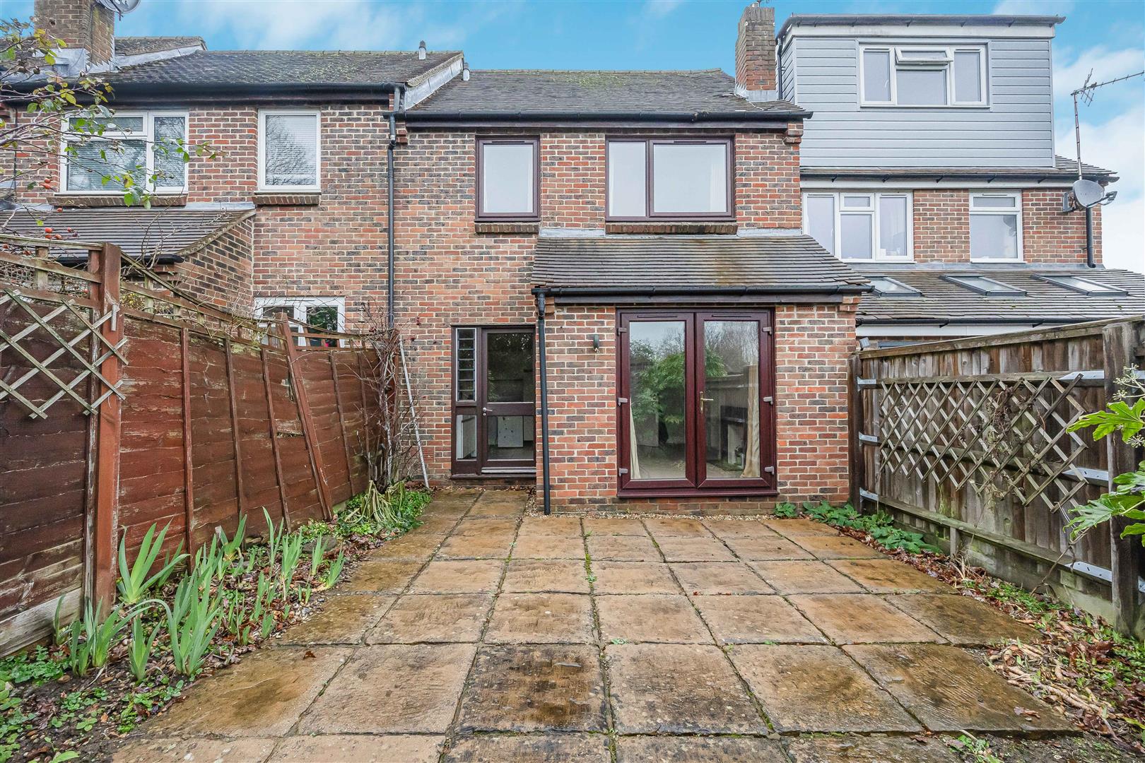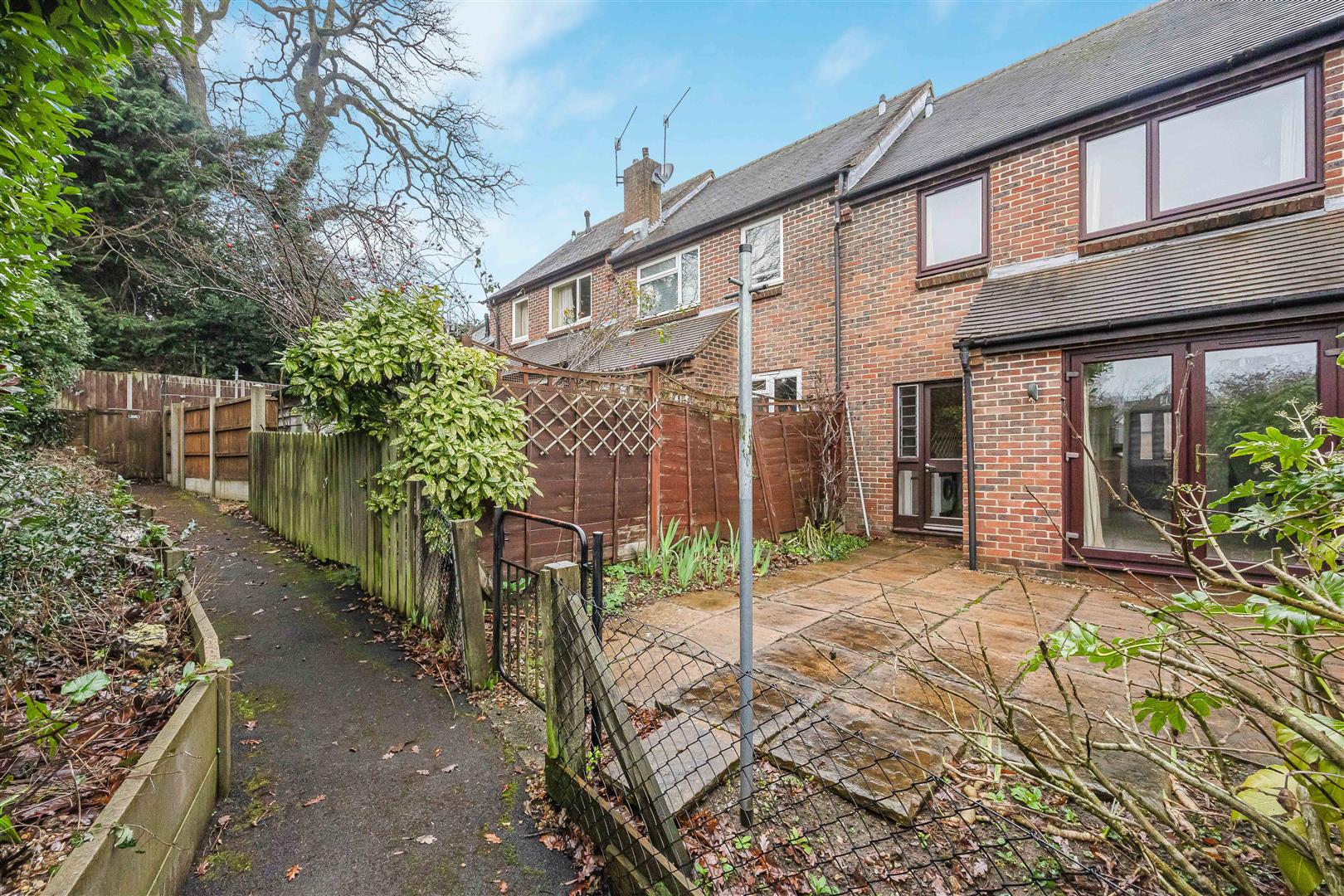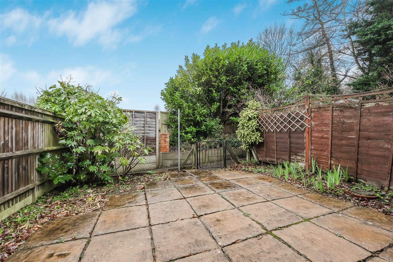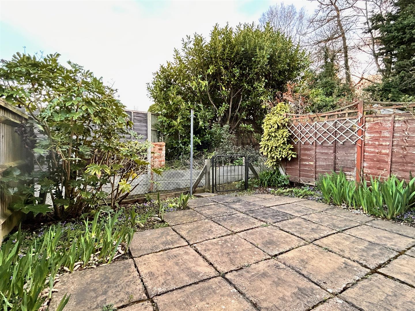 The south-facing low maintenance rear garden is fully paved with honey coloured York stone with flower borders, enclosed by wooden panel fencing to either side and a metal fence to the rear. A gate leads to a pathway running along the terrace, providing convenient access to the front of the property.