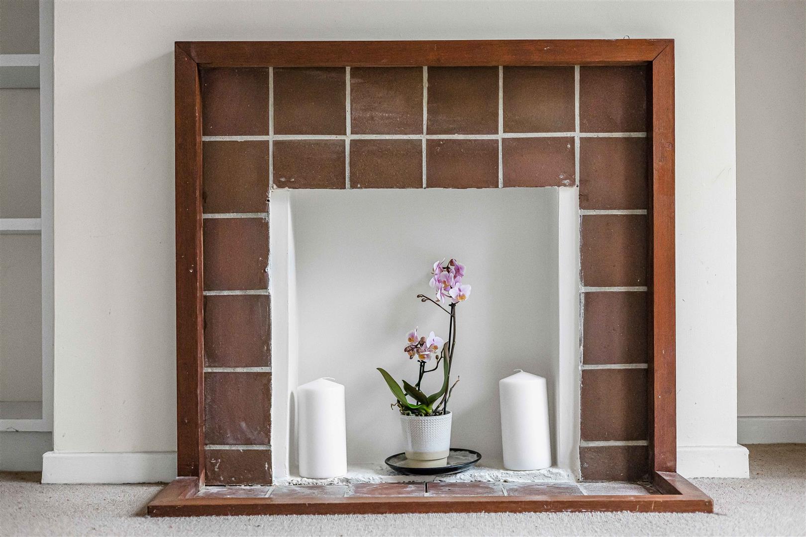 To the rear, the bright living room benefits from a ornamental fireplace and double-glazed French doors opening directly onto the garden, flooding the space with natural light. There is also a bespoke bookcase.