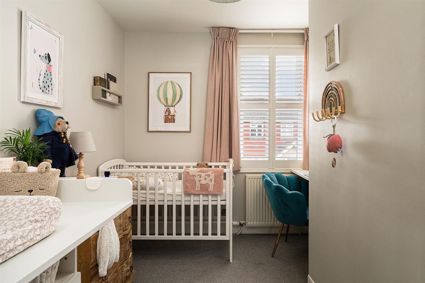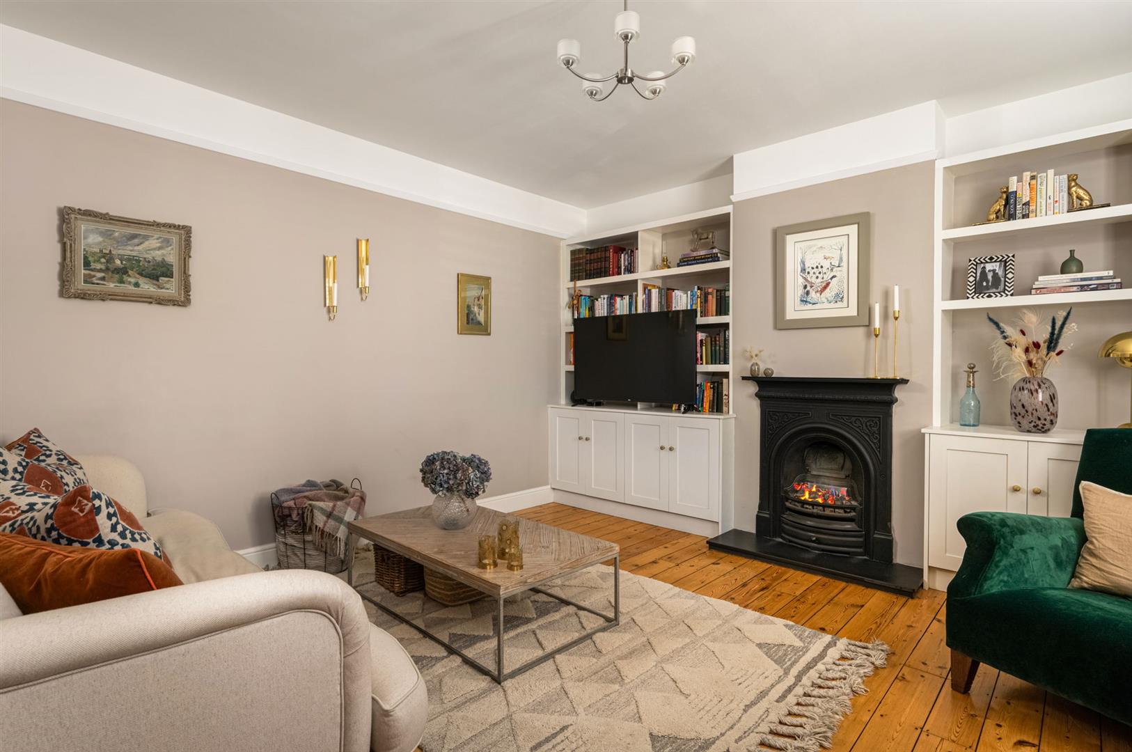 The sitting room has a front aspect with a modern double-glazed sash-style window with bespoke plantation shutters. Refurbished original wooden floorboards, the cast-iron fireplace has a slate hearth and houses a ‘real flame’ gas fire. Bespoke fitted book shelving and cupboards sit to either side of the chimney breast.