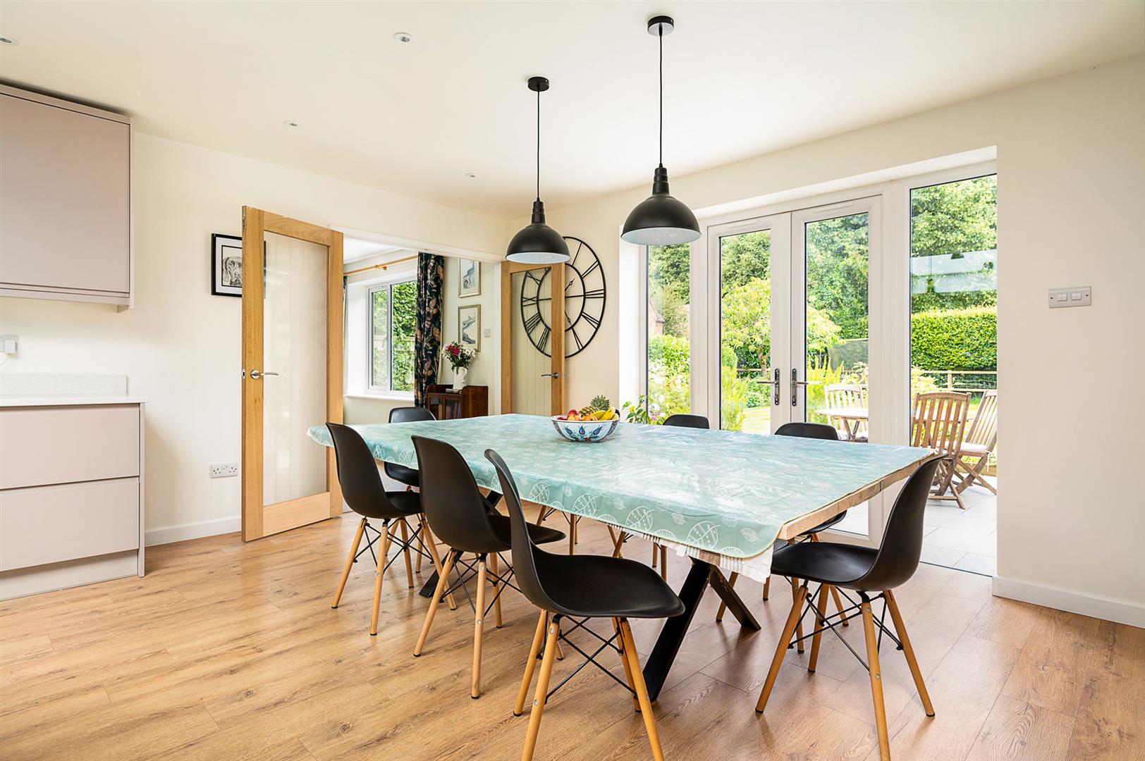A gravel driveway with private parking and a gravel path lead up to the main entrance, with a composite front door. This opens into the main reception space - a large open-plan room which is the centre of the house, featuring laminate wood flooring with some underfloor heating and a high ceiling with a bright roof lantern. A seating area makes use of the cosy fireplace. The fitted 'Wren' kitchen features a large island in the centre of the space, with a quartz composite worktop, breakfast bar, a stainless steel sink with a tap and boiling water tap built in, an integrated dishwasher and storage under. Fitted wall and base units continue around the room and further integrated appliances include a separate fridge and freezer, a 2-oven 'Stoves' range cooker with induction hob and stainless steel extractor hood, and an integrated microwave. In the dining area, further cupboards and quartz worktops make a Welsh-dresser style unit, with a wine fridge. There is space for a 12-seater rectangular dining table, beside the French doors to the garden.